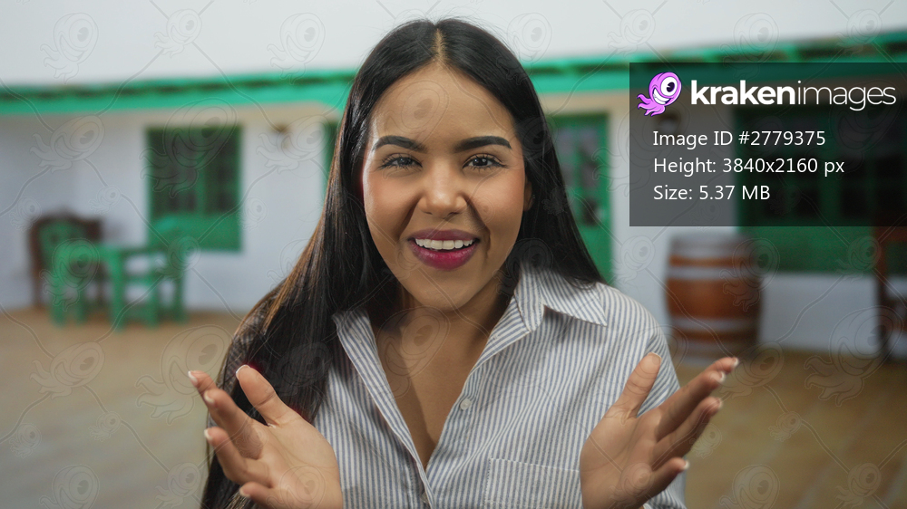 Young hispanic woman smiling outdoors near traditional building with green accents showing joyful expression through her gestures.
