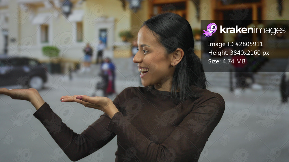 Young hispanic woman smiling outdoors on a bustling city street with hands extended presenting something.