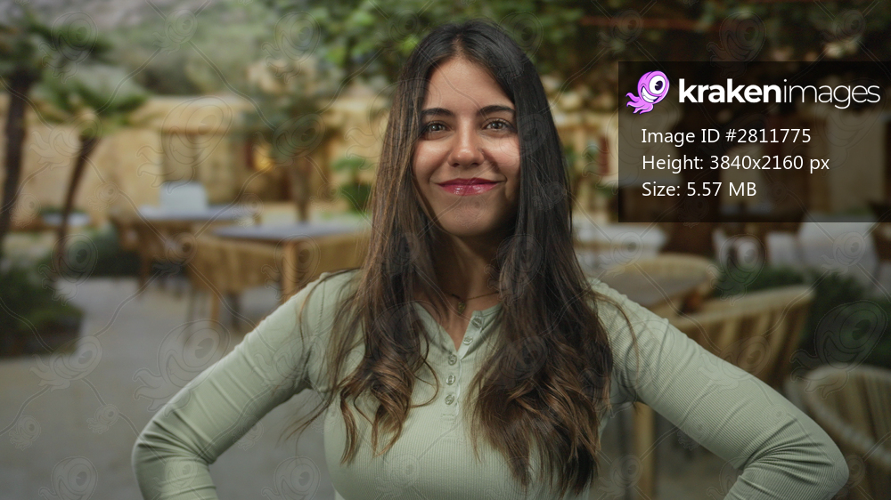 Young hispanic woman smiling outdoors on a restaurant terrace capturing a relaxed moment among street cafe settings with trees and seating.
