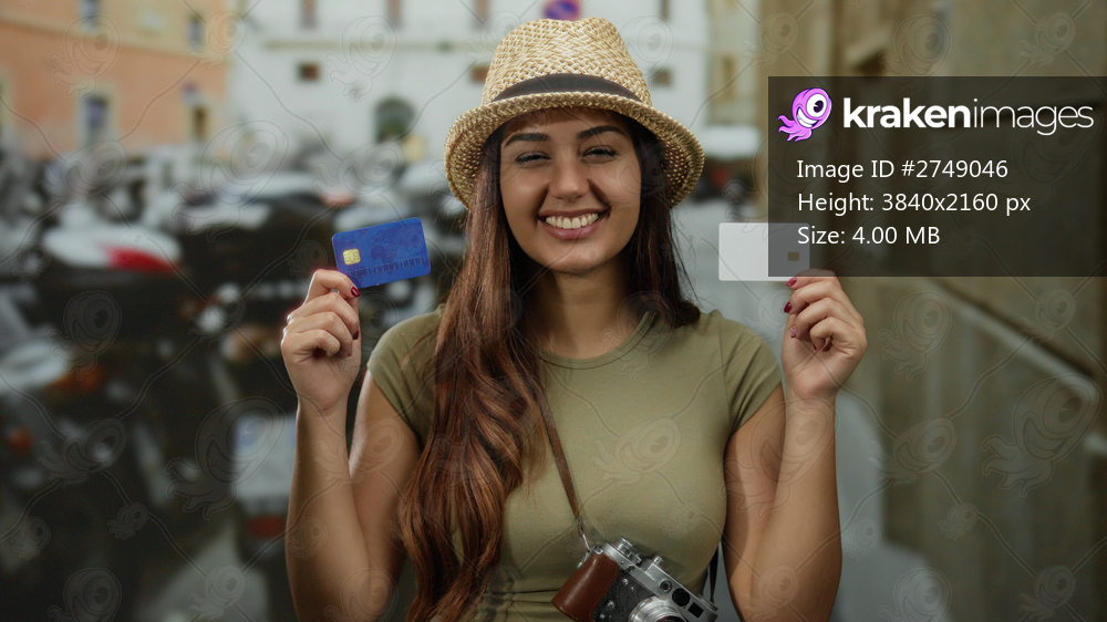 Young hispanic woman smiling outdoors on a street holding credit cards with a camera around her neck, demonstrating a travel concept.