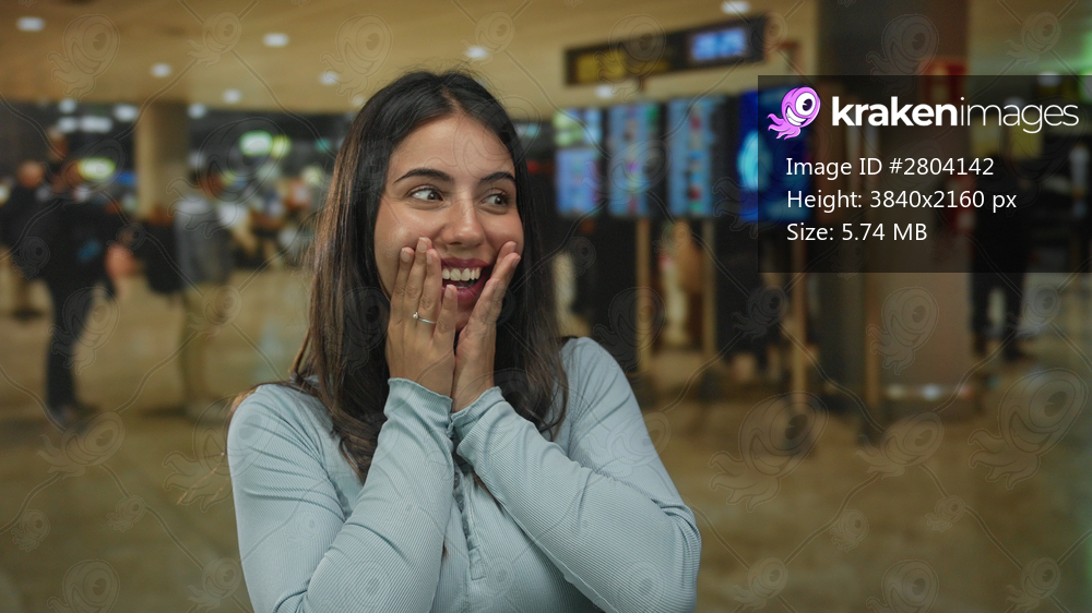 Young hispanic woman smiling places hands on cheeks in airport terminal; surprise arrival welcome moment.