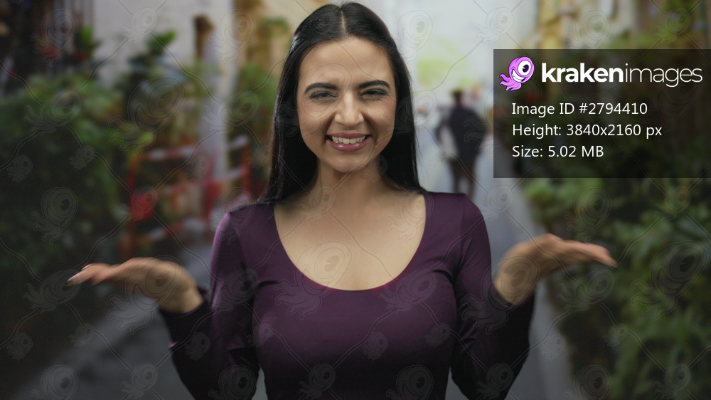 Young hispanic woman smiling playfully in a vibrant outdoor street setting, mimicking binoculars gesture, with lush foliage lining the urban path.