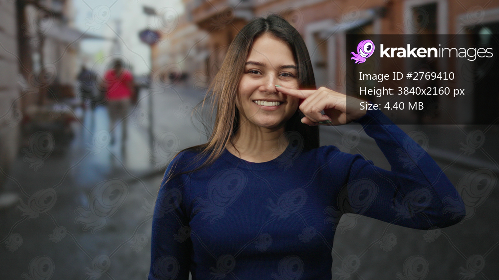 Young hispanic woman smiling and pointing at her nose while standing on a vibrant outdoor street background, expressing a playful and joyful demeanor.