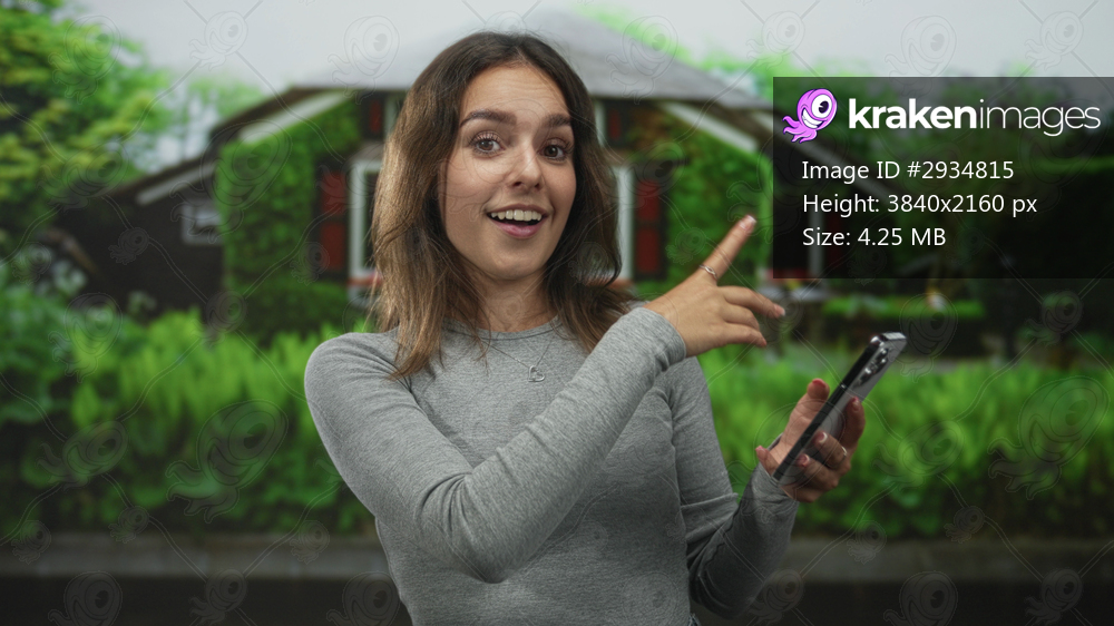 Young hispanic woman smiling and pointing finger at house entrance building while holding smartphone in right hand; surprise curiosity.