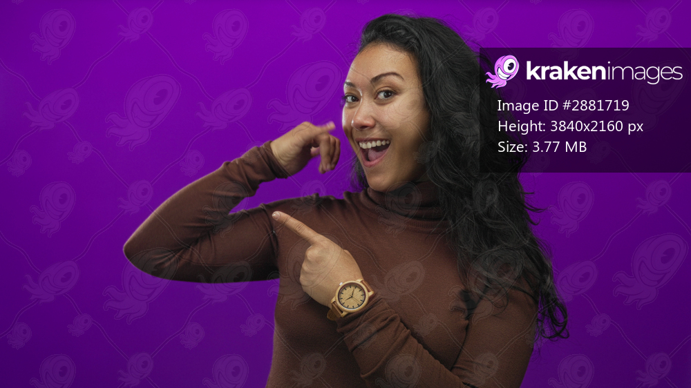 Young hispanic woman smiling and pointing finger at wristwatch wearing brown turtleneck and wooden watch in purple studio; playful confidence.