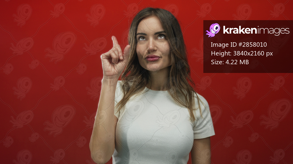 Young hispanic woman smiling and pointing finger upward in studio with red backdrop; creative inspiration.