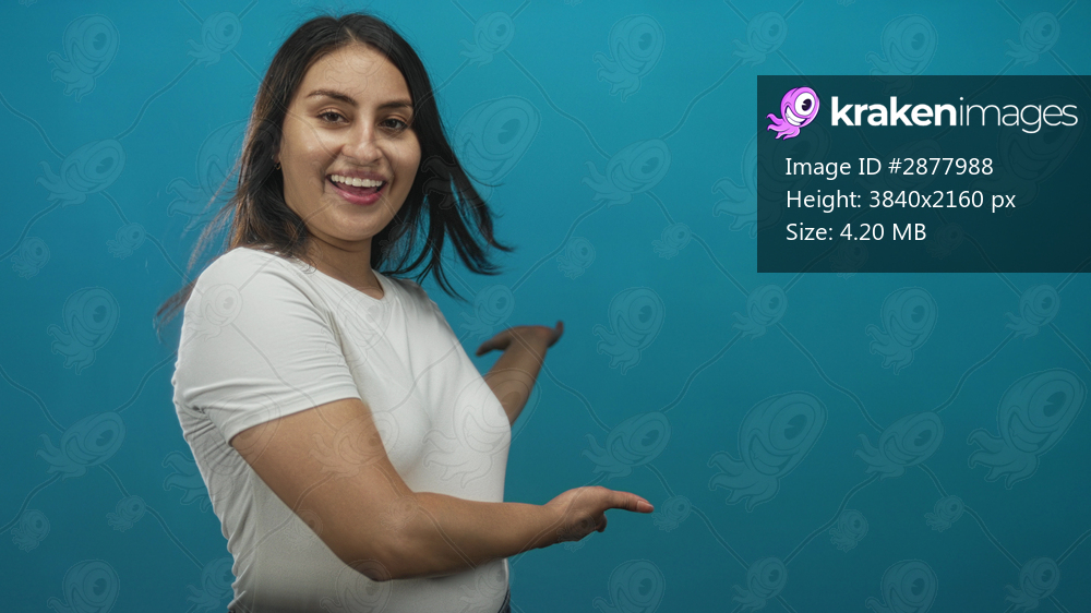 Young hispanic woman smiling and pointing with hands at teal studio wall while wearing a white t shirt; welcoming presentation.