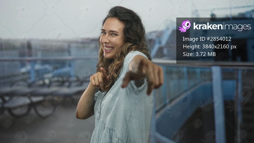 Young hispanic woman smiling points finger to camera on boat deck under overcast sky; excitement adventure.