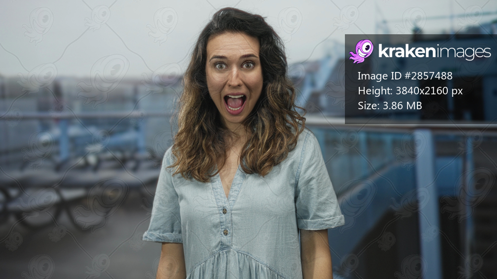 Young hispanic woman smiling points finger to camera on boat deck under overcast sky; excitement adventure.