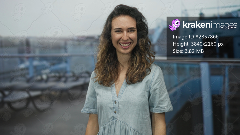 Young hispanic woman smiling points finger to camera on boat deck under overcast sky; excitement adventure.