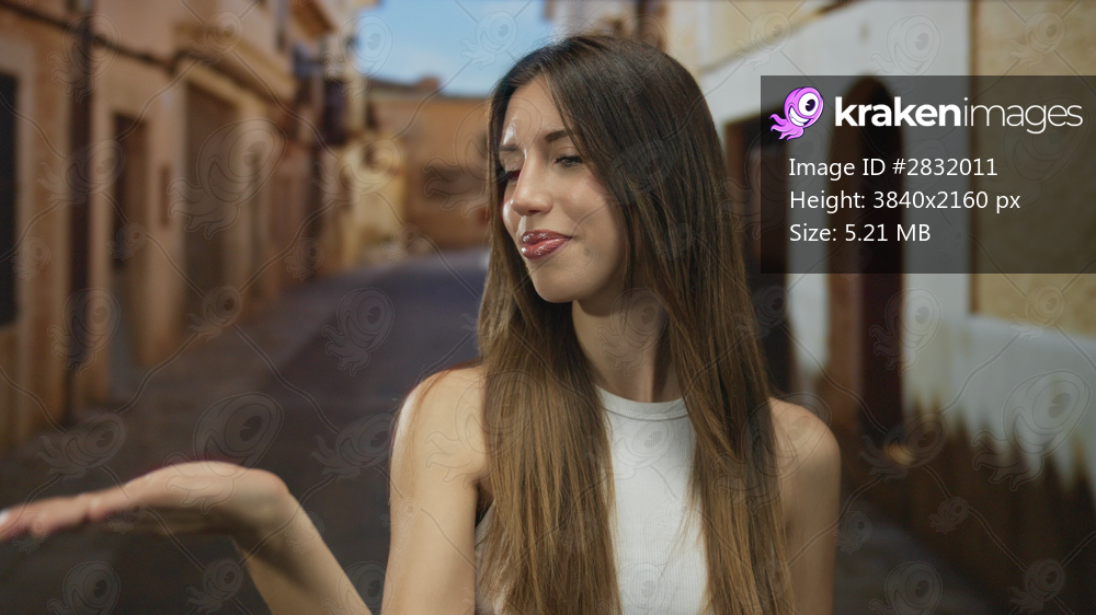 Young hispanic woman smiling points finger to her open palm on a sunlit old town street; highlight happiness.