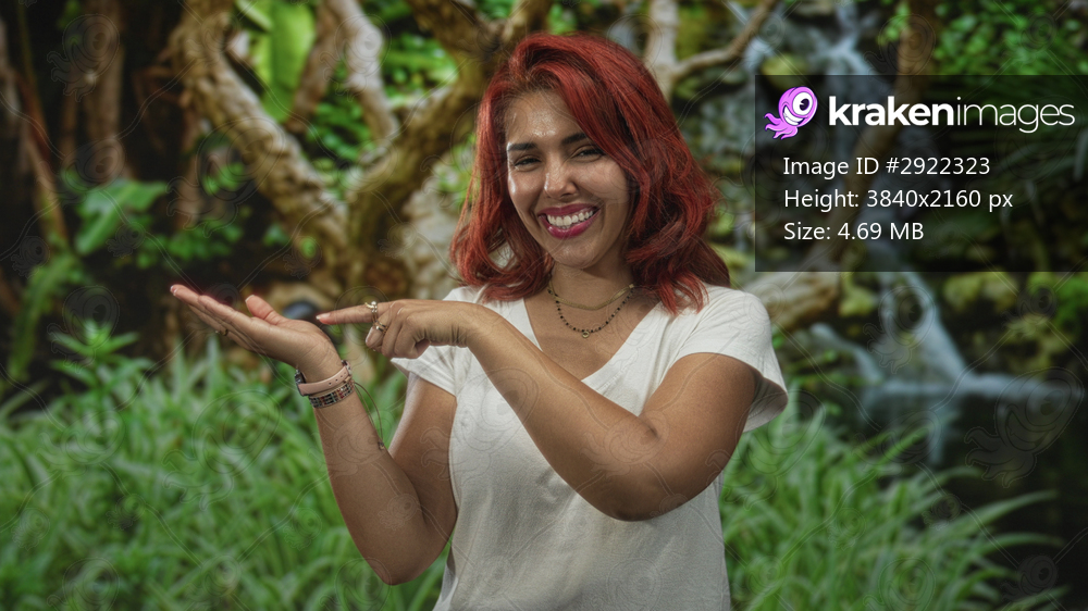 Young hispanic woman smiling points index finger to open palm and shows ok sign in forest; joy playful energy.