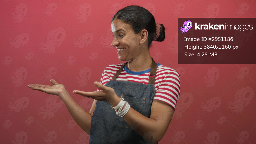 Young hispanic woman smiling and presenting both palms up in pink studio wearing denim apron and striped tee; friendly welcome.