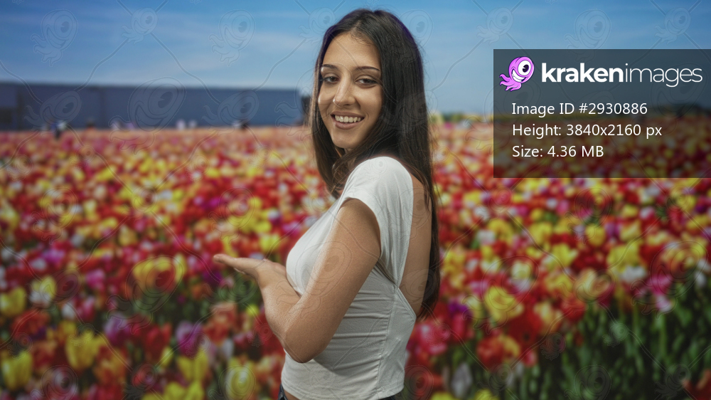 Young hispanic woman smiling presenting tulips with palm up in a colorful flower field near a building; spring joy serenity.