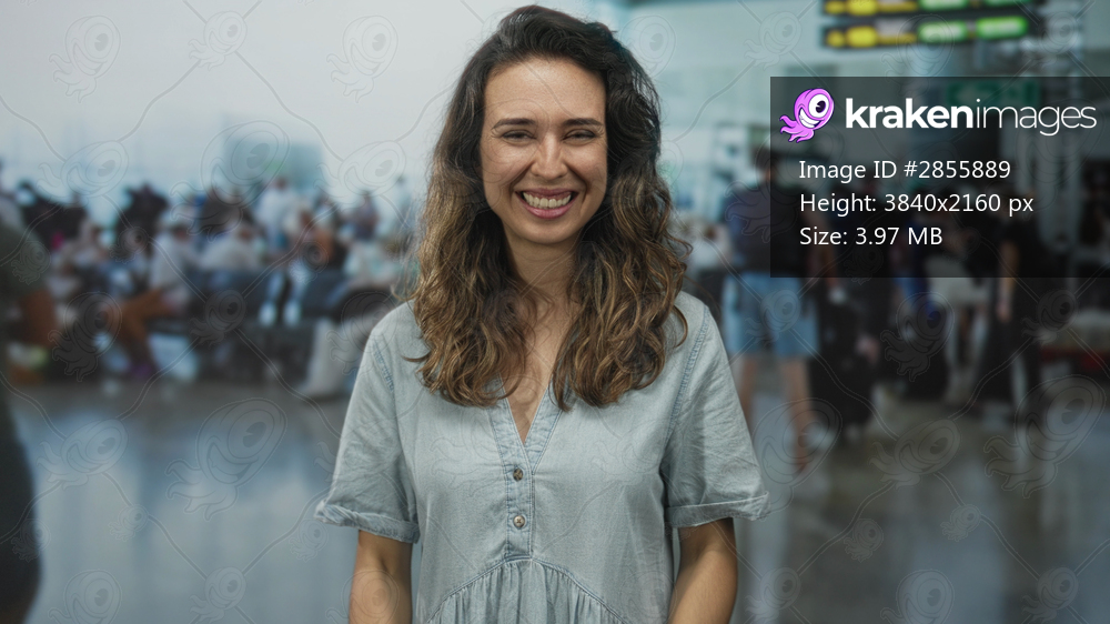 Young hispanic woman smiling and raising fists at a crowded modern airport terminal near departures gate; excitement.
