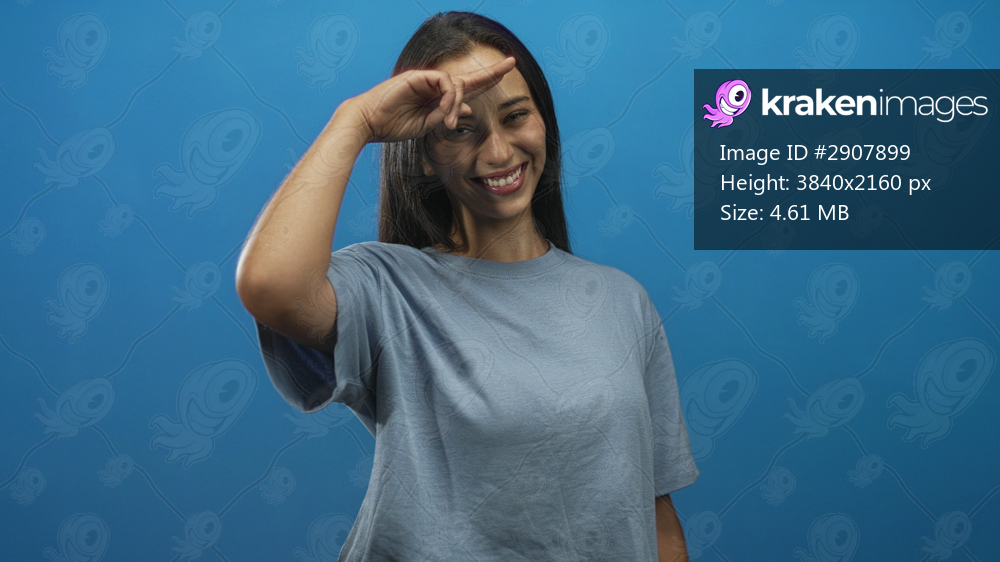 Young hispanic woman smiling and saluting with right hand to forehead in blue studio wearing a light gray t shirt and pointing; joy.