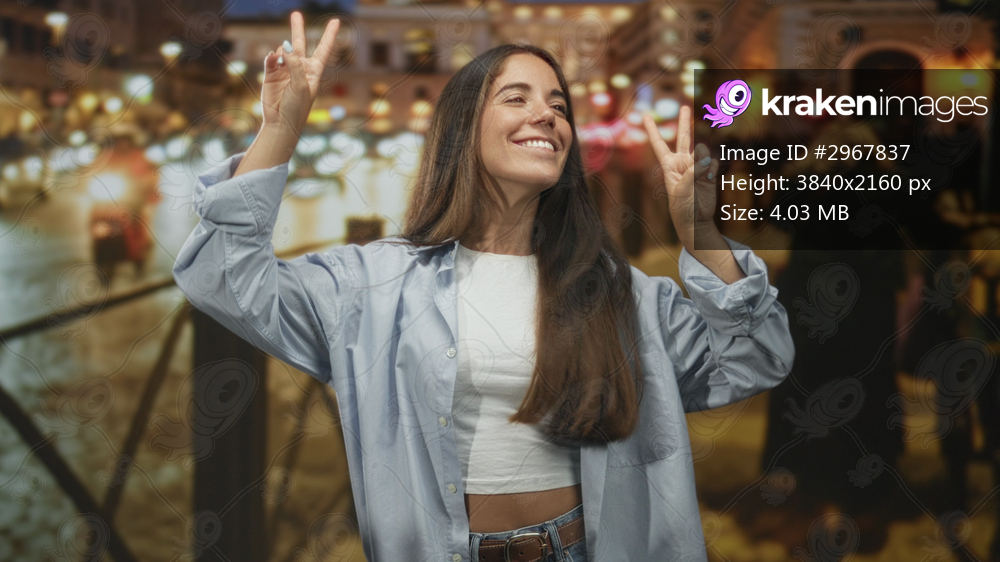 Young hispanic woman smiling and showing double peace signs with exposed midriff and long hair on a bustling street with blurred lights at night; joyful celebration. - Kraken Images