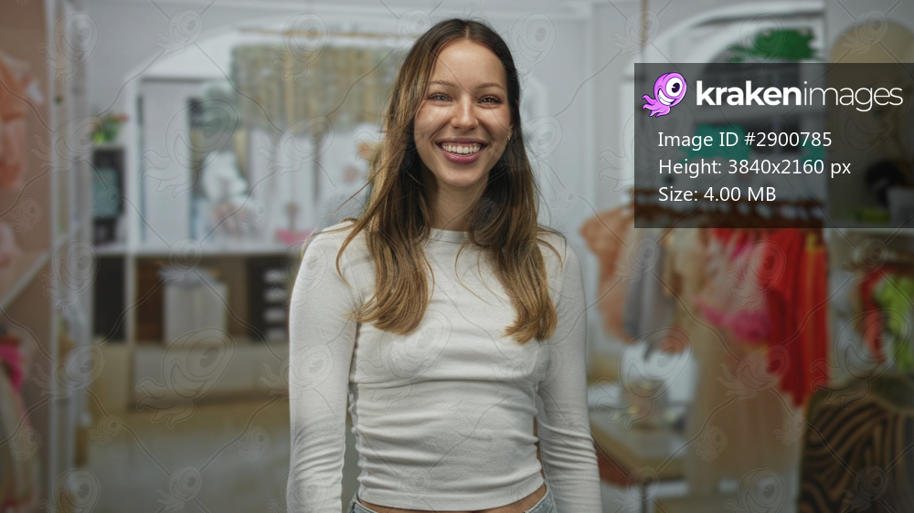 Young hispanic woman smiling and standing amid clothing racks in a store building wearing a white top and jeans; happiness.