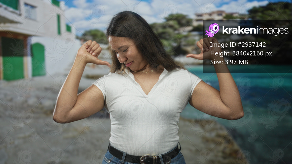 Young hispanic woman smiling with thumbs pointing to chest in studio with coastal mural, turquoise sea and rocky cove; self confidence.