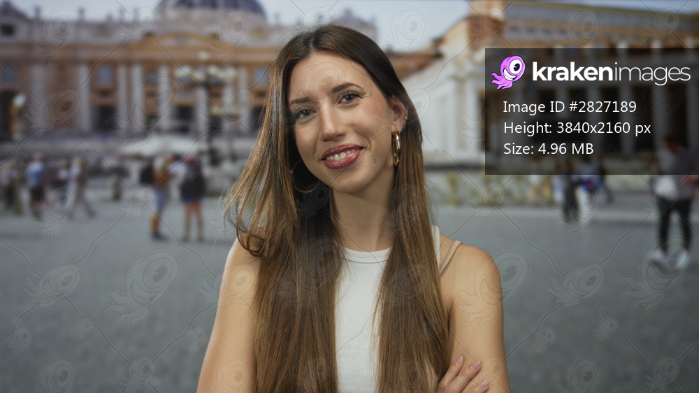Young hispanic woman smiling warmly on sunny morning in front of sunlit building facade at vatican; joy.