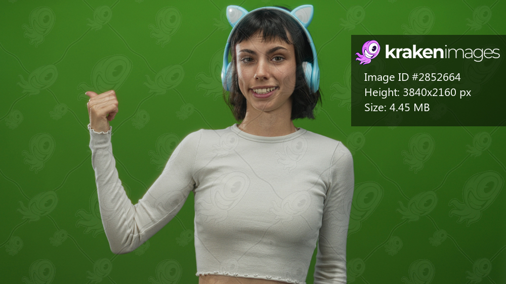 Young hispanic woman smiling and wearing cat-ear headphones giving thumbs up in green studio; confidence.