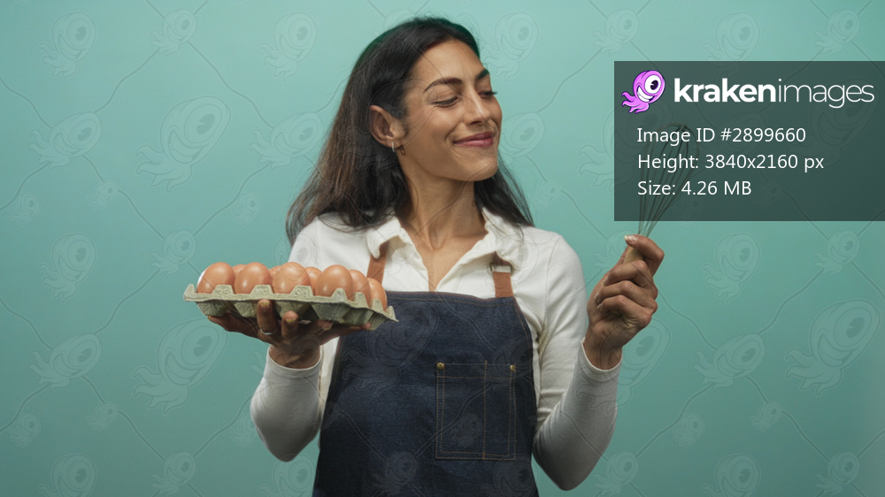 Young hispanic woman smiling while holding a full egg carton and metal whisk in a turquoise studio; baking contentment homemade warmth.