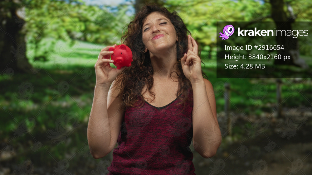 Young hispanic woman smiling while holding a red piggy bank and crossing fingers in a green park forest; saving hope.