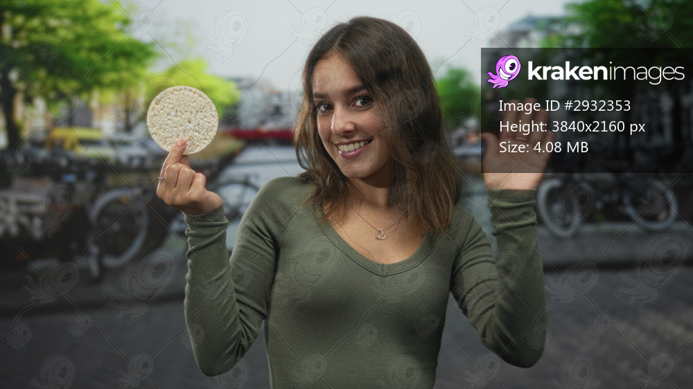 Young hispanic woman smiling while holding a rice cake up with one hand on an amsterdam street lined with bicycles; cheerful greeting.