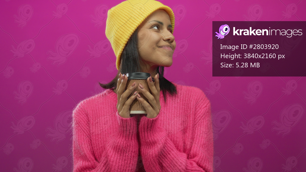 Young hispanic woman smiling while holding coffee over isolated pink background wearing yellow hat and pink sweater