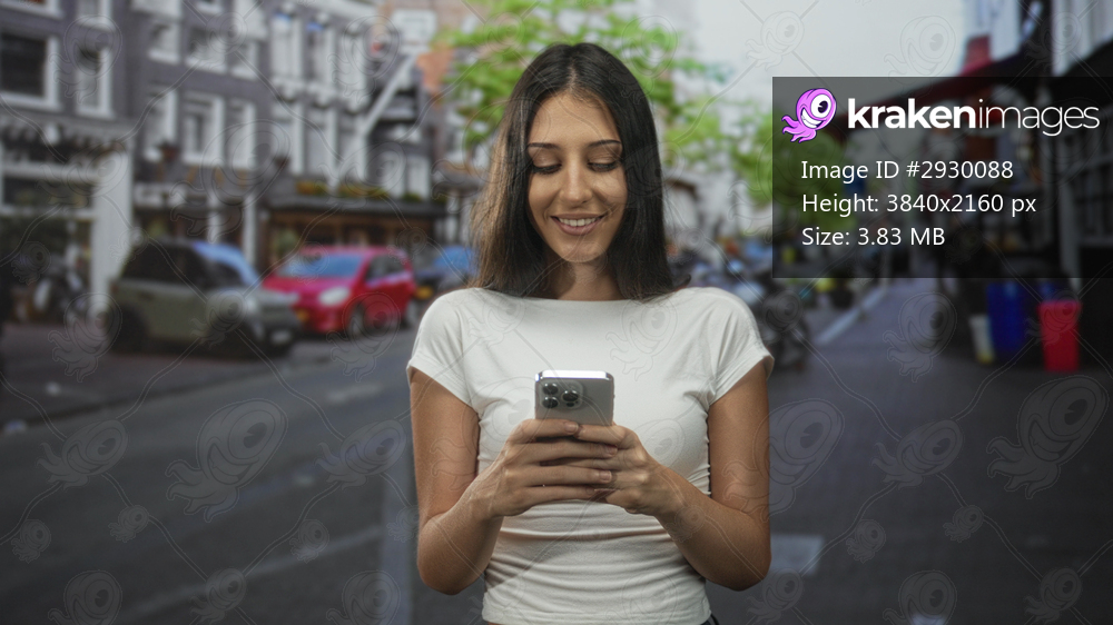 Young hispanic woman smiling while holding smartphone on a busy city street with parked cars and trees, looking down at screen; contentment.