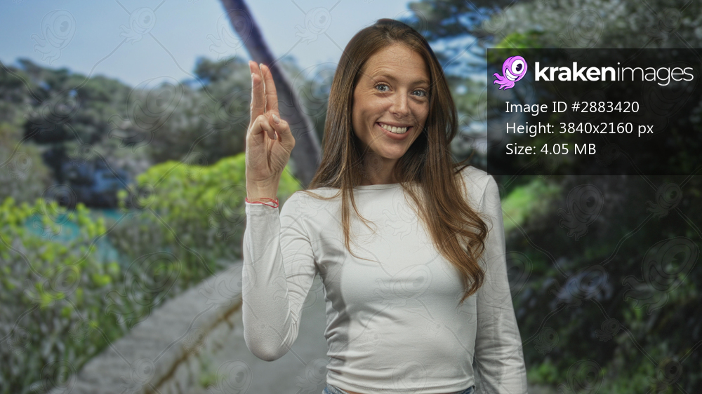 Young hispanic woman smiling while raising her hand with three fingers visible on a park path among green trees and shrubs; happiness.