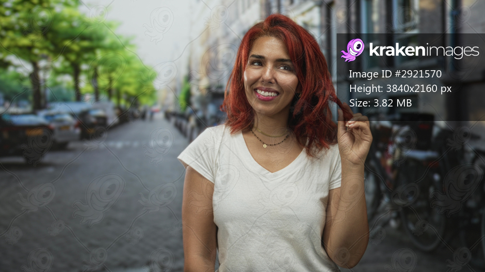 Young hispanic woman smiling while touching red hair on a cobblestone street with parked bicycles and cars; warm confidence.