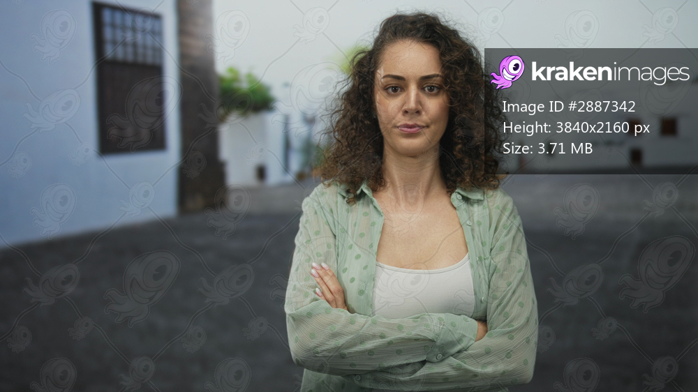 Young hispanic woman standing with arms crossed on a sunlit street in a sheer green shirt and white tank top; annoyance resilience.