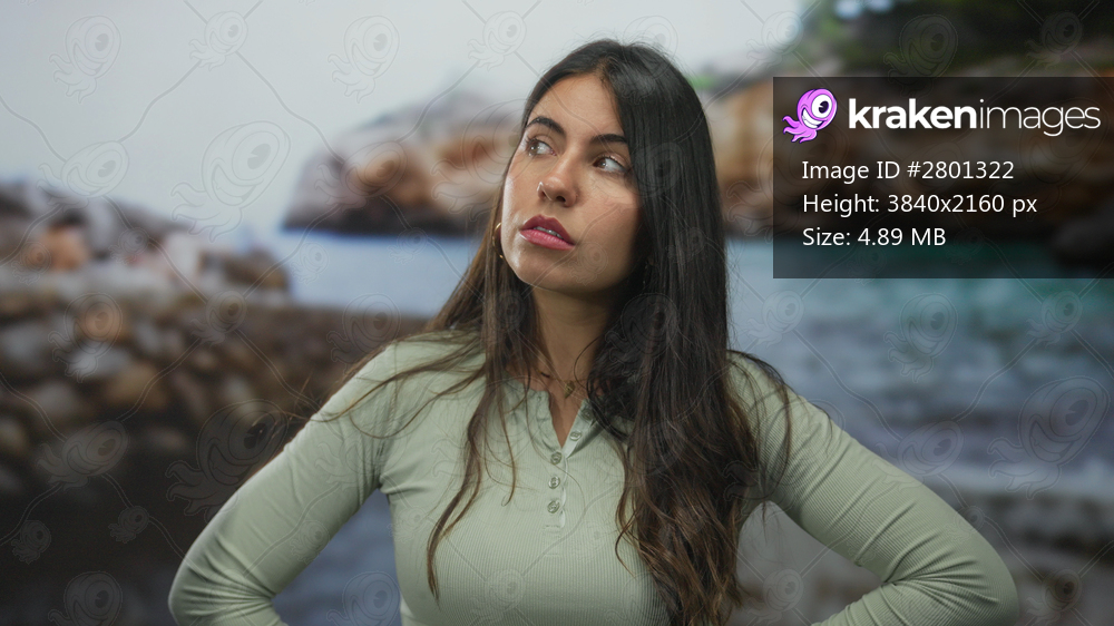 Young hispanic woman standing at seaside beach gazing pensively out towards the serene ocean under a clear sky showcasing a natural contemplative mood in a scenic outdoor setting. - Kraken Images