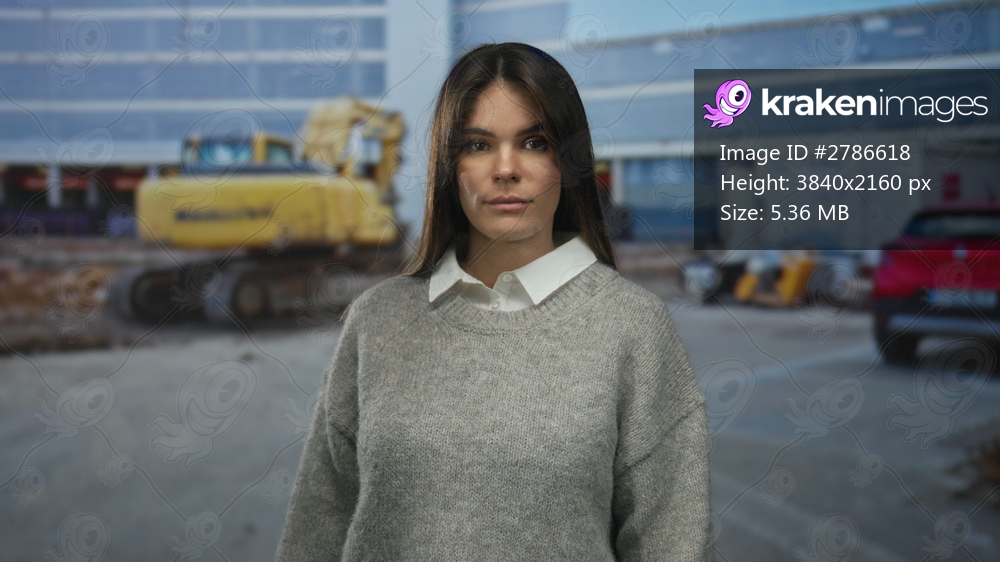 Young hispanic woman standing confidently at an outdoor construction site with heavy machinery in the background