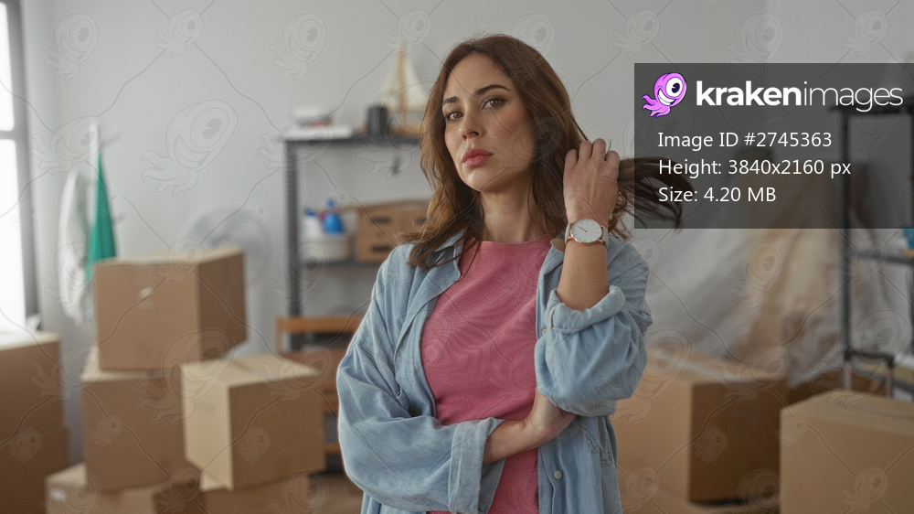 Young hispanic woman standing confidently in a new apartment surrounded by unpacked boxes and minimalist decor suggesting a recent move