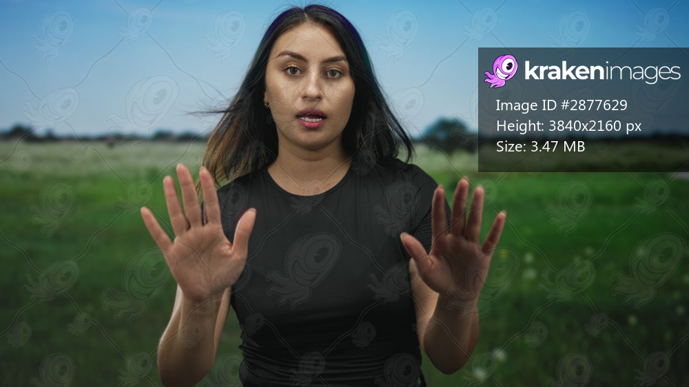 Young hispanic woman standing with hands raised palms out, palms facing camera in forest meadow with green grass and wildflowers; caution personal space. - Kraken Images