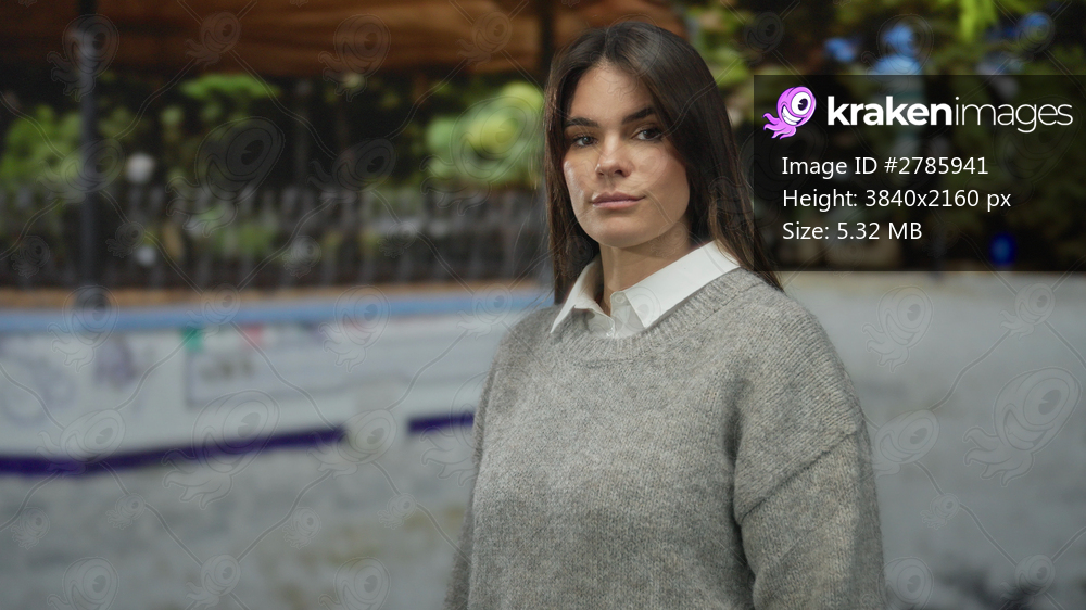 Young hispanic woman standing on a city street wearing a grey sweater and white shirt, with a serious expression outdoors under a blurred leafy background. - Kraken Images