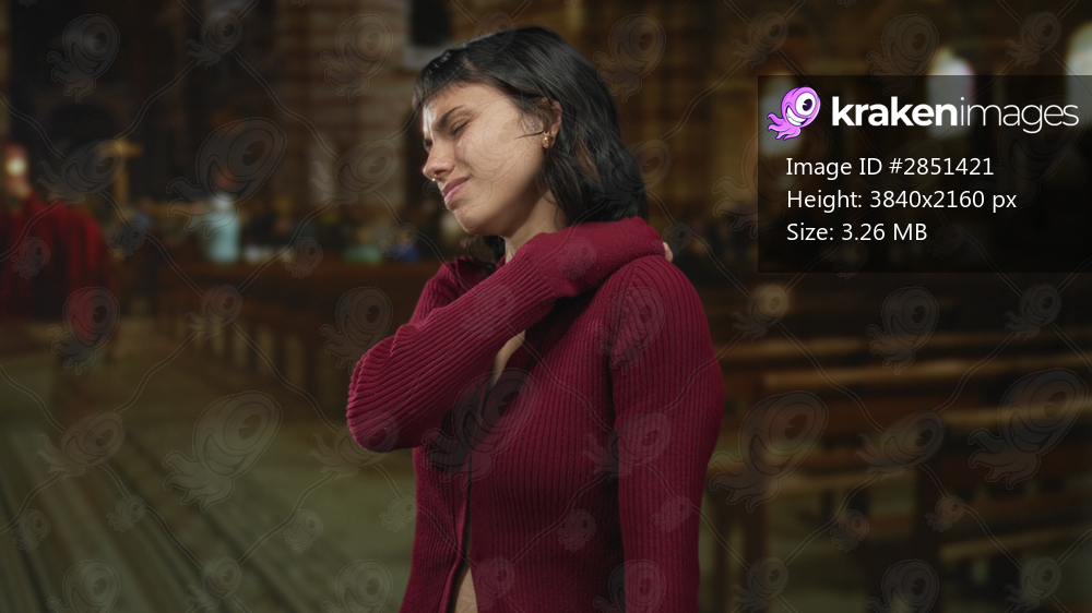 Young hispanic woman stands alone and rubs shoulder with closed eyes inside church building; quiet contemplation.