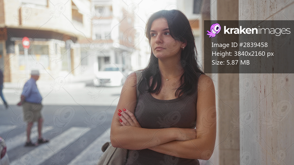 Young hispanic woman stands with arms crossed holding shoulder bag on busy street under soft sunlight; quiet contemplation.