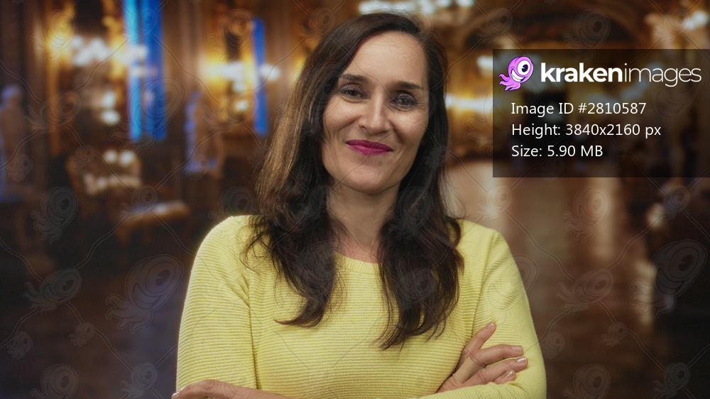 Young hispanic woman stands with arms crossed in museum galleries surrounded by ornate displays; calm confidence contemplation serenity.