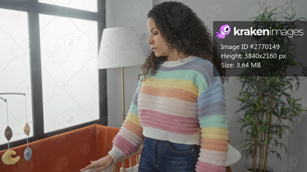 Young hispanic woman stands beside orange baby crib in cozy interior bedroom, showcasing vibrant sweater, room decor, and soft lighting.
