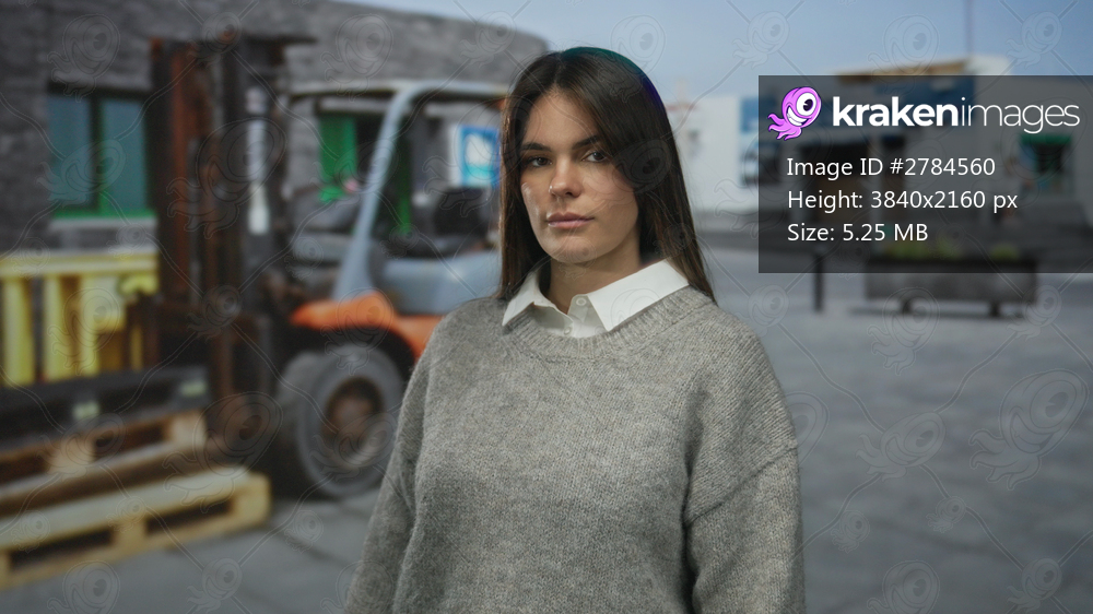 Young hispanic woman stands confidently on a city street, surrounded by urban elements like a forklift and pallets, under a clear sky, dressed in casual attire. - Kraken Images