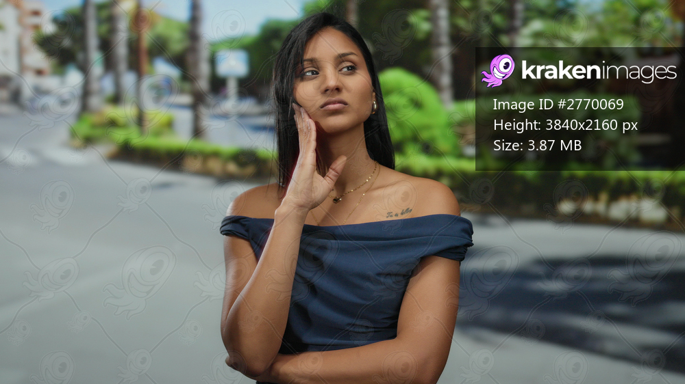Young hispanic woman stands contemplatively on a sunny street with lush greenery and palm trees creating a serene outdoor urban setting.