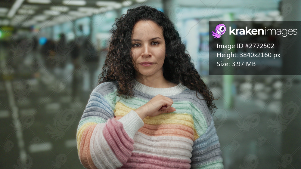 Young hispanic woman stands in an indoor airport terminal extending her fist toward the camera wearing a rainbow sweater amidst a blurred busy background. - Kraken Images