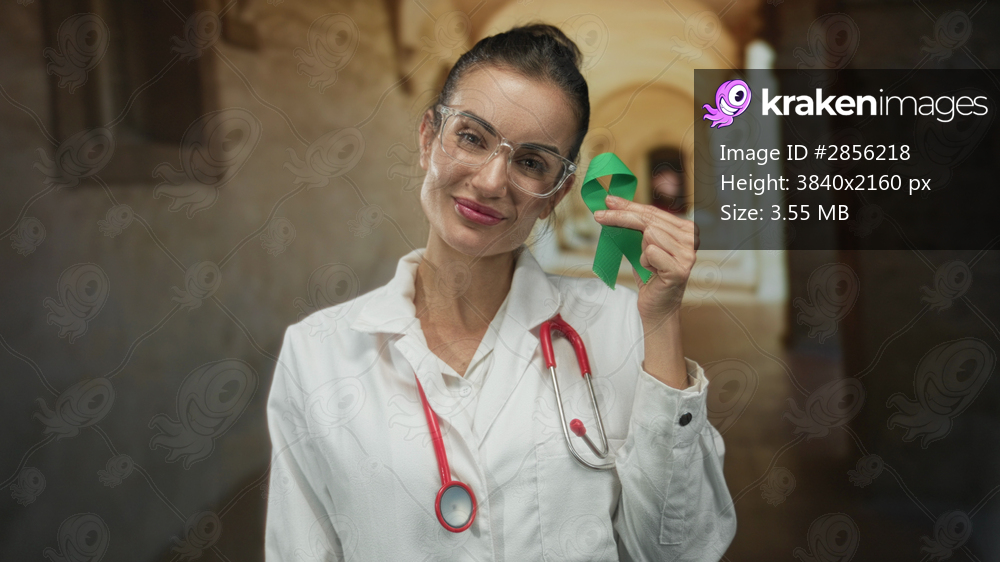 Young hispanic woman with stethoscope smiles holding green ribbon in old town building corridor; hope.