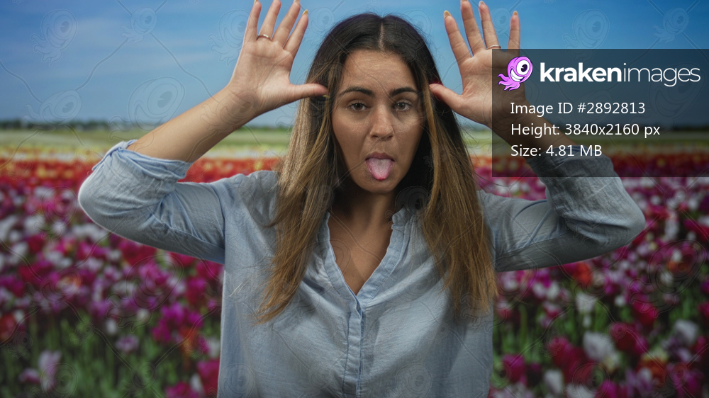 Young hispanic woman sticking tongue out with hands raised to head in studio tulip field under blue sky; playful mischief.