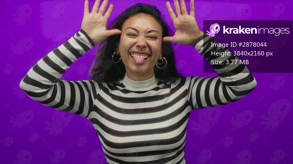 Young hispanic woman sticking tongue out with hands raised wearing hoop earrings and striped top in studio; playful mischief confidence.