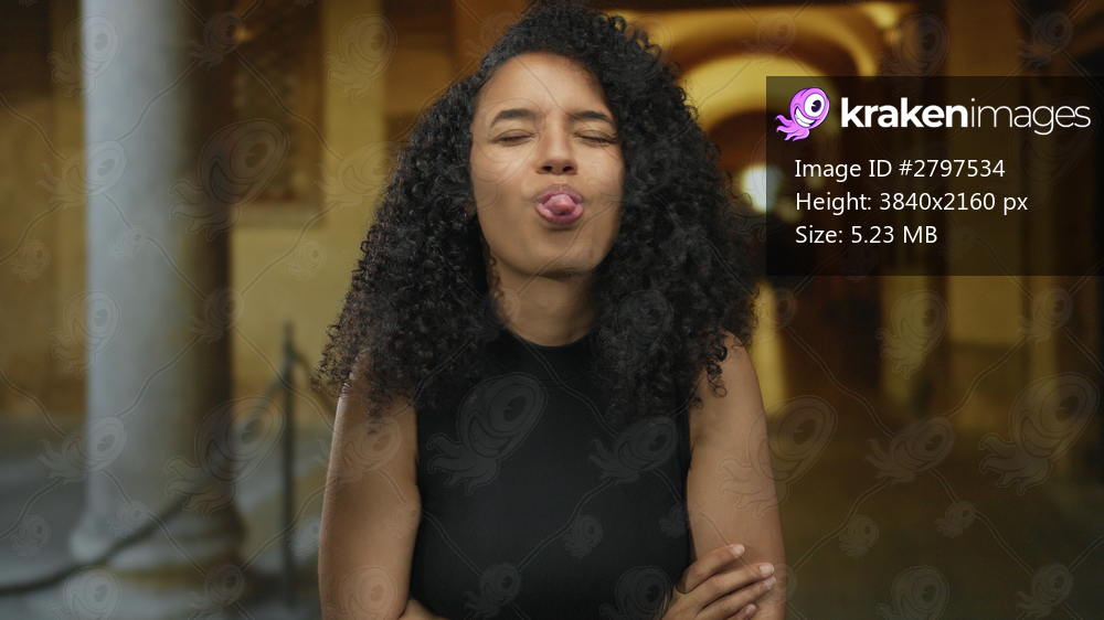 Young hispanic woman sticks tongue out in old town street archway while crossing arms; playful rebellion.