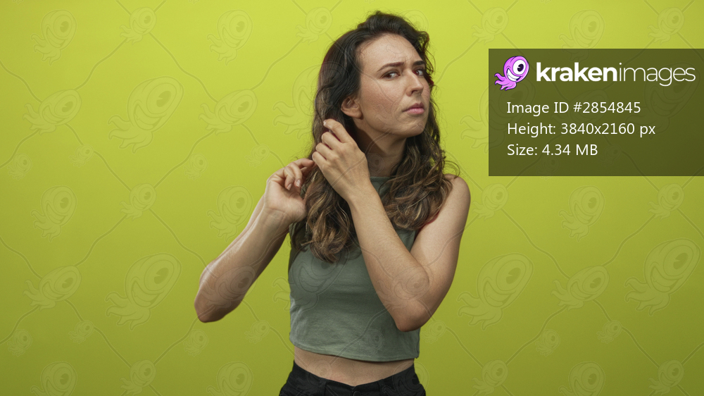 Young hispanic woman styling long hair with her fingers in a bright green studio; confidence self care empowerment.